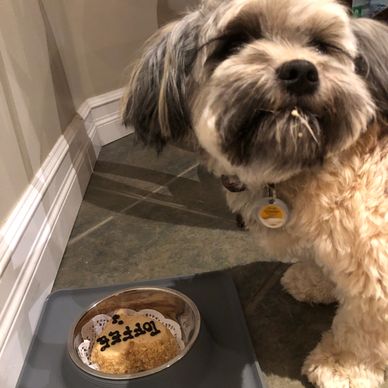 Hello Corinne and family! I hope you all are doing well. I Just wanted to send you a fun picture of Toffee turning 2! Time flies with puppies! Toffee is strong, healthy, comical and a whopping 20lbs of pure muscle! Vet checks have been super! No health conditions, skin rashes or bad teeth. All good reports! Please feel free to contact us if you ever make it to the big city! We would love for you to see how Toffee and grown and become such a big part of our lives! Take care! Maureen and Jamie