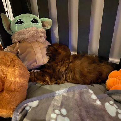 I’ll be sure to update you as he grows with us. Thank you for such a loving, curious, adventurous and charming little pup! He’s exactly what we needed in a pup and we couldn’t be happier with his temperament and personality. Enjoy a pic of him snuggling Grogu.